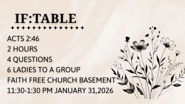 A ladies get together to connect with each other and God. Two hours, 4 questions, and 6 ladies to a group. Bring a dish to pass. Meets monthly, and we are always looking for hosts.